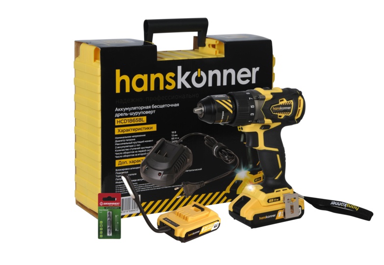 Шуруповерт Hanskonner HCD1645BLC поставляется с двумя сменными аккумуляторами 2.0 Ач и зарядным устройством в сумке-кейсе.